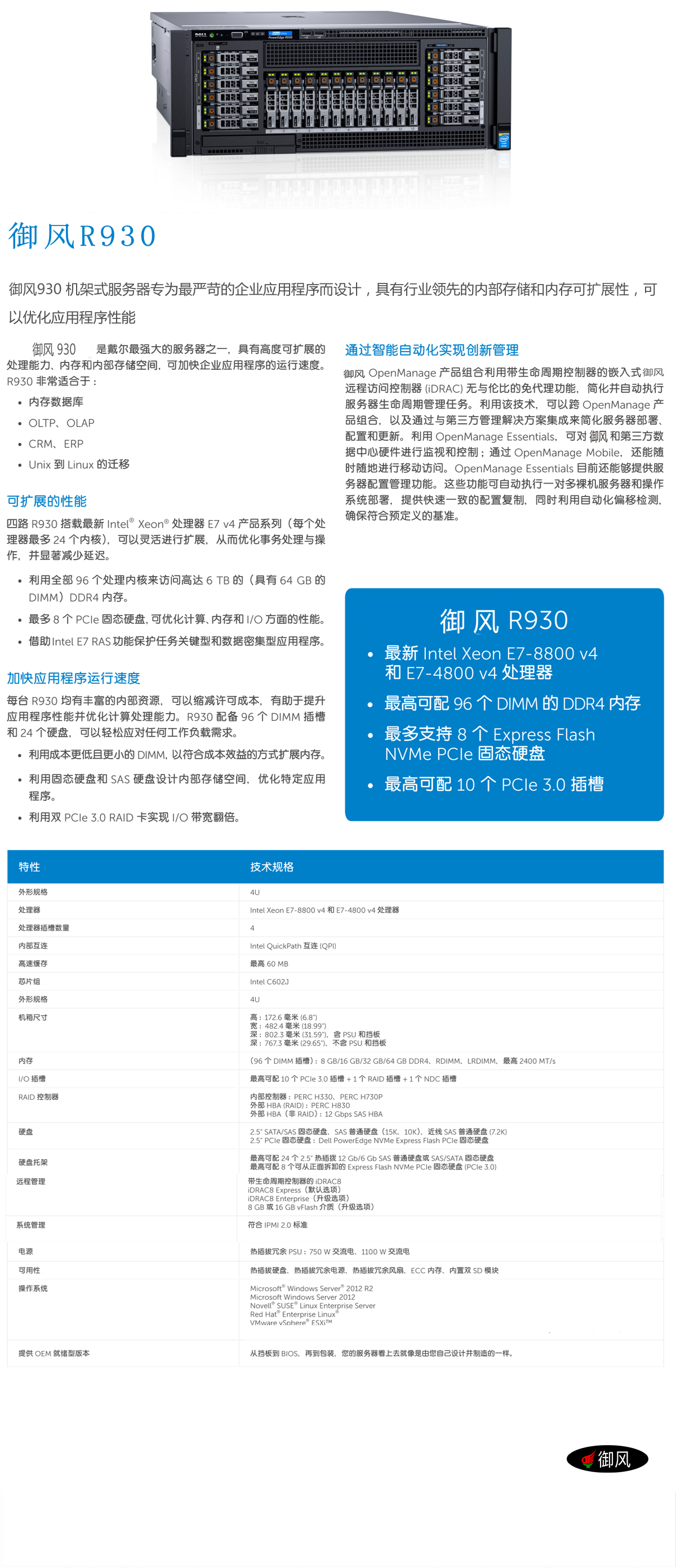 御风 R930机架式务器专为最严苛的企业应用设计,具有行业领先的内部存储和内存可扩展性,可以优化应用程序性能。
